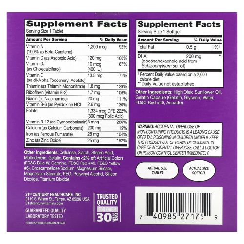 Описание товара 21st Century, Prenatal c мультивитаминами/минералами + докозагексаеновая кислота, 2 бутылки, 60 таблеток/60 желатиновых капсул