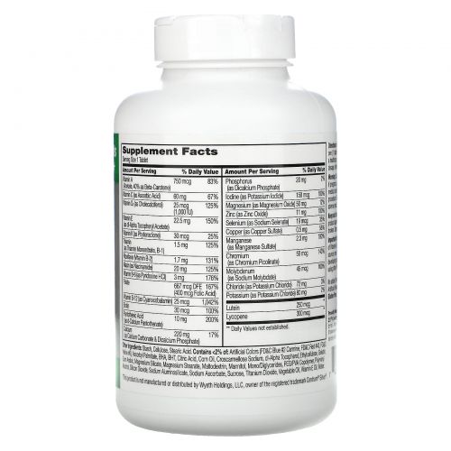 Крахмал, целлюлоза, стеариновая кислота. Содержит < 2%: искусственных красителей (краситель синий 2 FD&C, кармин, краситель красный 40 FD&C, краситель желтый 6 FD&C), аскорбил пальмитата, бутилоксианизола, бутилгидрокситолуола, лимонной кислоты, кукурузного масла, кроскармеллоза натрия, dl-альфа токоферола, этилцеллюлозы, желатина, аравийской камеди, силиката магния, стеарата магния, мальтодекстрин, маннита, моно/диглицеридов, сополимера ПЭГ/ПВА, поливинилового спирта, диоксид кремния, алюмосиликата натрия, аскорбата натрия, сахарозы, диоксида титана, растительного масла, масла из витамина E, воды.