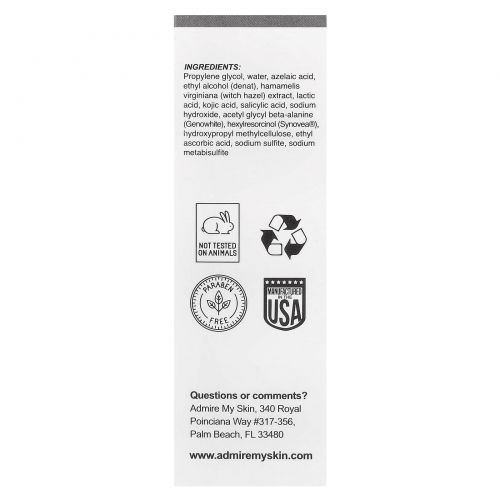 Другие ИнгредиентыПропиленгликоль, вода, азелаиновая кислота, этиловый спирт (денат), экстракт гамамелиса (Hamamelis virginiana), молочная кислота, койевая кислота, салициловая кислота, гидроксид натрия, ацетилглицил бета-аланин (геноуайт), гексилрезорцин (Synovea®), гидроксипропилметилцеллюлоза, этиловая аскорбиновая кислота, сульфит натрия, метабисульфит натрия.