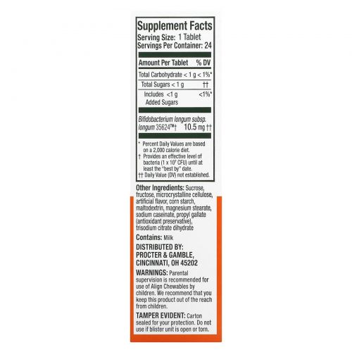Описание товара Align Probiotics, Поддержка пищеварения 24/7, пробиотическая добавка, жевательные таблетки, бананово-клубничный смузи, 24 жевательные таблетки