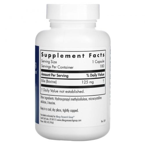 Описание товара Allergy Research Group, Желчь крупного рогатого скота, 125 мг, 180 растительных капсул