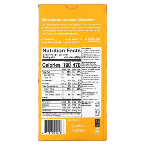 Описание товара Alter Eco, органический темный шоколад, миндаль, 85% какао, 75 г (2,65 унции)