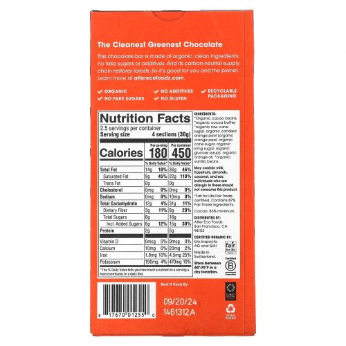 Описание товара Alter Eco, органический темный шоколад, со вкусом апельсина, 85% какао, 75 г (2,65 унции)