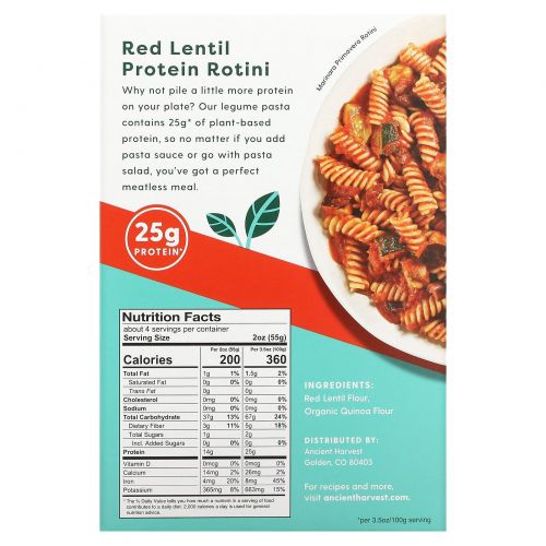 Описание товара Ancient Harvest, Растительная протеиновая паста, ротини из красной чечевицы, 227 г (8 унций)