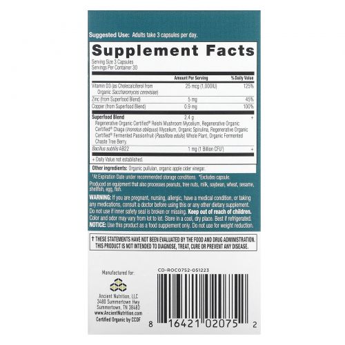 | Смесь суперфудов мицелий грибов рейши с сертификатом Regenerative Organic Certified®, мицелий чаги (Inonotus obliquus), органическая спирулина, цельное растение ферментированной маракуйи (Passiflora edulis) с сертификатом Regenerative Organic Certified®, органические ферментированные ягоды витекса. | 2,4 г | + |