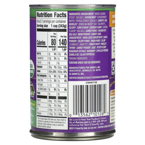 Описание товара Annie's Homegrown, Органический куриный суп с лапшой, 396 г (14 унций)