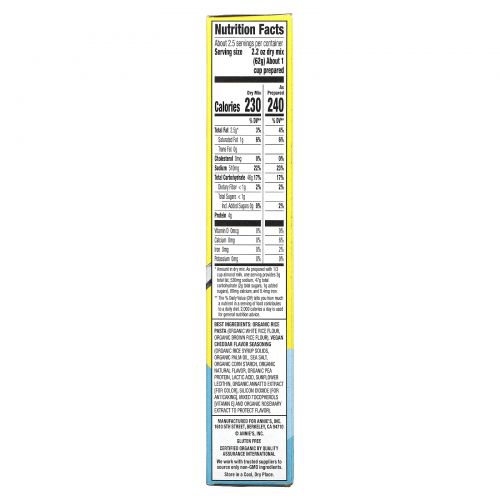 Органическая рисовая паста (органическая белая рисовая мука, органическая мука из коричневого риса), веганская приправа со вкусом чеддера (органические сухие вещества рисового сиропа, органическое пальмовое масло, морская соль, органический кукурузный крахмал, органический натуральный ароматизатор, органический гороховый протеин, молочная кислота, подсолнечный лецитин, органический экстракт аннато [для цвета], диоксид кремния [для предотвращения слеживания], смесь токоферолов [витамин Е] и органический экстракт розмарина для защиты вкуса).