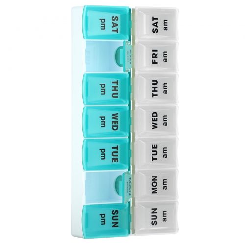 Органайзер для таблеток на неделю с учетом приема два раза в день имеет контурный дизайн, чтобы таблетки было легко вынимать. Отсеки с вкладками легко открываются и надежно закрываются. Обязательно соблюдайте последовательность приема и дозировку, указанные на этикетке ваших лекарств.