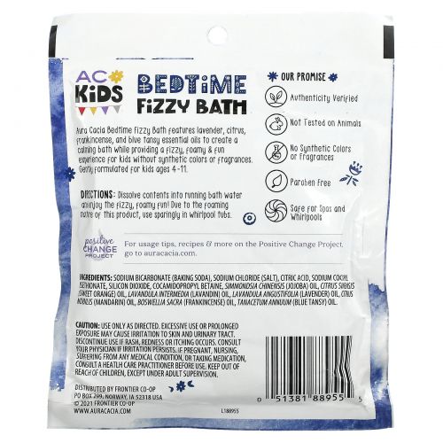 Aura Cacia Bedtime Fizzy Bath содержит эфирные масла лаванды, цитрусовых, ладана и голубой пижмы, которые создают успокаивающую ванну и придают ей пенящуюся пену. & веселый опыт для детей без синтетических красителей и отдушек. Разработано специально для детей от 4 до 11 лет.