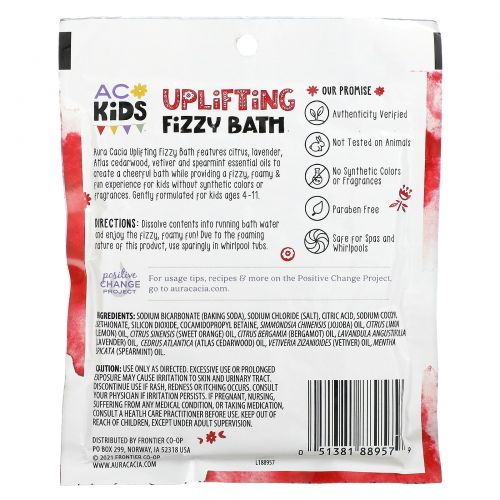 Aura Cacia Uplifting Fizzy Bath содержит эфирные масла цитрусовых, лаванды, атласского кедра, ветивера и мяты. & веселый опыт для детей без синтетических красителей и отдушек. Разработано специально для детей от 4 до 11 лет.