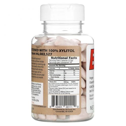 B-Fresh Gum производит коренную революцию на рынке освежителей дыхания. Освежители дыхания, которые сегодня доступны потребителю, в основном предназначены для маскировки неприятного запаха изо рта, скрывая проблему благодаря сильному запаху. B-Fresh Gum естественным образом изменяет кислотность во рту так, что она борется с бактериями, которые вызывают кариес, зубной налет и неприятный запах изо рта. B-Fresh Gum не содержит сахара, соли и консервантов. Запатентованная формула сочетания ксилита, кальция и витамина B12 позволяет B-Fresh gum превосходить любые другие продукты для свежести дыхания на рынке сегодня.