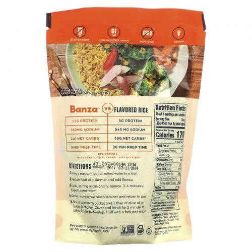 Описание товара Banza, Рис из нута, чесночное и оливковое масло, 198 г (7 унций)