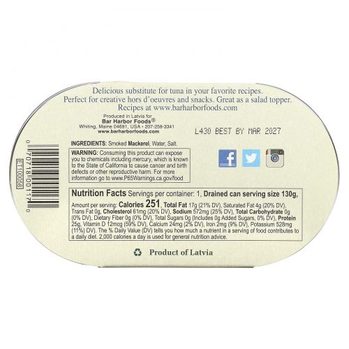 Описание товара Bar Harbor, Филе дикорастущей макрели, 190 г (6,7 унции)
