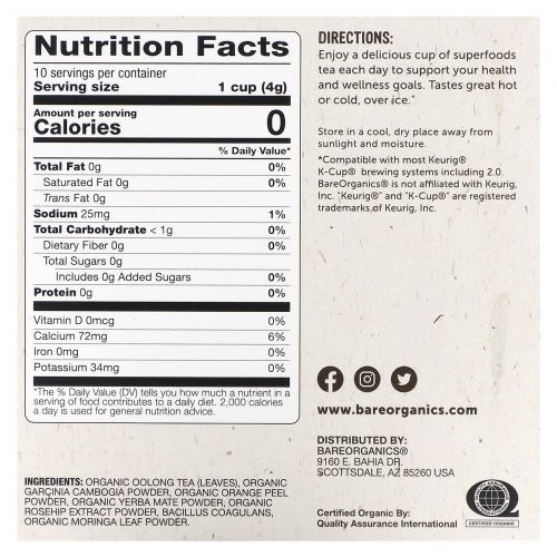 Описание товара BareOrganics, Metabolism, чай с суперфудами, улун, 10 чашек по 4 г (0,14 унции)