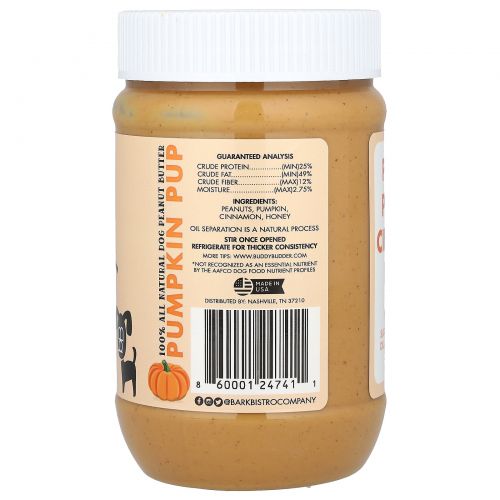 Описание товара Bark Bistro, Buddy Budder, арахисовая паста, для собак, тыква, 480 г (17 унций)