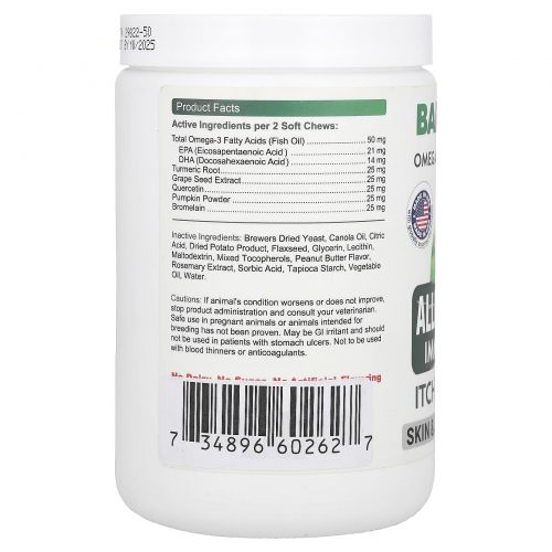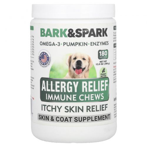 Описание товара Bark&Spark, Allergy Relief, Immune, жевательные таблетки, для снятия зуда, для собак, арахисовое масло, 180 жевательных таблеток, 396 г (13,9 унции)