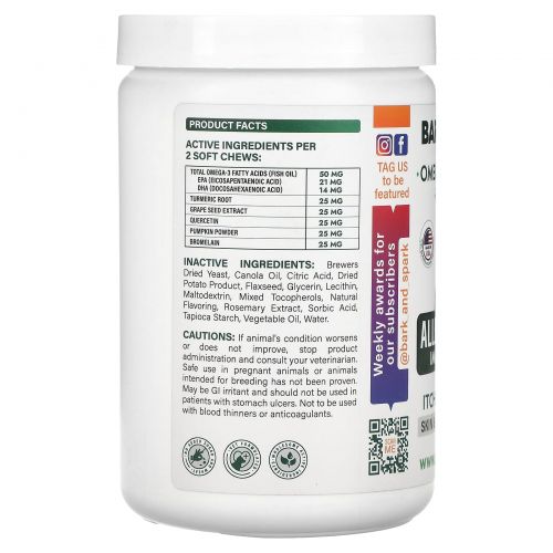 Описание товара Bark&Spark, жевательная таблетка от аллергии и зуда, для собак, курица, 180 жевательных таблеток, 369 г (13,9 унции)