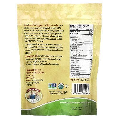 Описание товара Barlean's, Органические семена чиа, 340 г (12 унций)