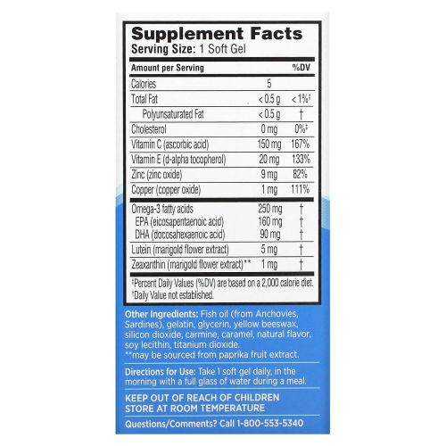 Рыбий жир (из анчоусов, сардин), желатин, глицерин, желтый пчелиный воск, диоксид кремния, кармин, карамель, натуральный ароматизатор, соевый лецитин, диоксид титана.