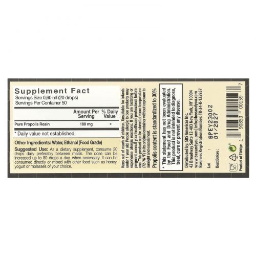 ПредупрежденияХранить в недоступном для детей месте. Не подходит для детей младше 1 года. У людей с аллергией на продукты пчеловодства могут возникать аллергические реакции. Перед применением в период лактации или беременности следует проконсультироваться с врачом. Этот продукт можно хранить при комнатной температуре (72–76 ºF) в оригинальной упаковке без воздействия солнечных лучей и чрезмерного тепла.