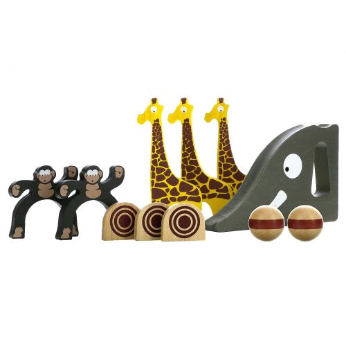 Этот набор для боулинга с удобной рампой для слона, чтобы прицелиться и стрелять, двумя деревянными шарами, а также множеством жирафов, обезьян и мишеней заставит детей бегать и завывать от смеха. Изготовлено из каучукового дерева и окрашено пятнами на водной основе, безопасными для детей. Идеально подходит для детей от 2 лет.