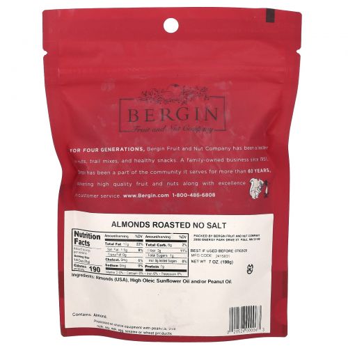Описание товара Bergin Fruit and Nut Company, Жареный миндаль, неупакованный, 198 г (7 унций)