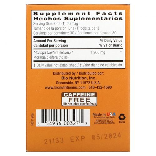 Описание товара Bio Nutrition, Чай с морингой, 30 чайных пакетиков, 2,1 унции (58,8 г)