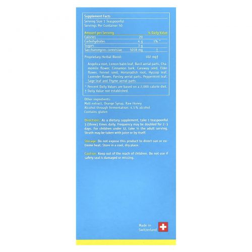 | Патентованная смесь трав: Корень ангелики, лист мелиссы лимонной, надземные части базилика, цветок ромашки, кора коричного дерева, семена тмина, цветок бузины, семена фенхеля, корень хрена, лист иссопа, цветок лаванды, надземные части петрушки, лист мяты перечной, лист шалфея и надземные части тимьяна. | 102 мг | † |