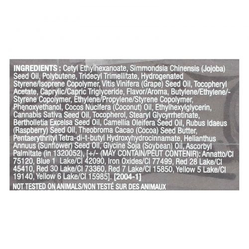 Другие ИнгредиентыЦетил этилгексаноат, масло из семян жожоба (Simmondsia chinensis), полибутен, тридецил тримеллитат, гидрогенизированный изопренстирольный сополимер, масло из виноградных косточек (Vitis vinifera), токоферилацетат, каприловый/каприновый триглицерид, ароматизатор, сополимер бутилена/этилена/стирола, сополимер этилена/пропилена/стирола, феноксиэтанол, кокосовое масло (Cocos nucifera), этилгексилглицерин, конопляное масло (Cannabis sativa), токоферол, стеарил глицирретинат, масло из семян березы (Bertholletia Excelsa), масло из семян камелии масличной (Camellia oleifera), масло семян малины (Rubus idaeus), масло из зерен какао (Theobroma cacao), пентаэритритил тетра-ди-трет-бутил гидроксигидроциннамат, подсолнечное масло (Helianthus annuus), соевое масло (Glycine soja), аскорбил пальмитат (в № 1320052), [может содержать аннато (CI 75120), краситель синий 1 лак (CI 42090), оксиды железа/CI 77499, краситель красный 28 лак (CI 45410), краситель красный 30 лак/CI 73360, краситель красный 7 лак (CI 15850), краситель желтый 5 лак (CI 19140). краситель желтый 6 лак (CI 15985).