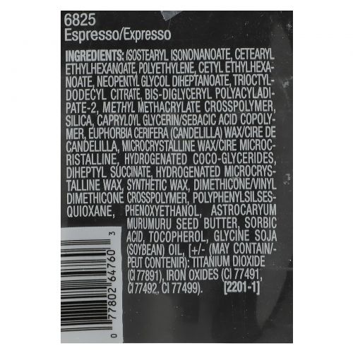 Другие Ингредиентыизостеарил изононаноат, цетеариловый этилгексаноат, полиэтилен, цетил этилгексаноат, неопентилгликоль дигептаноат, триоктилдодецилцитрат, бис-диглицерил полиациладипат-2, метил метакрилат кроссполимер, диоксид кремния, каприлоил глицерин/сополимер себациновой кислоты, канделильский воск (Euphorbia cerifera), микрокристаллический воск, гидрогенизированные кокоглицериды, дигептил сукцинат, гидрогенизированный микрокристаллический воск, синтетический воск, диметикон/винил диметикон кроссполимер, полифенилсилсесквиоксан, феноксиэтанол, масло семян мурумуру (Astrocaryum murumuru), сорбиновая кислота, токоферол, соевое масло (Glycine soja) , [может содержать диоксид титана (CI 77891), оксиды железа (CI 77491, CI77492, CI 77499).