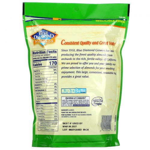 С 1910 года компания Blue Diamond Growers производит миндаль лучшего качества из фруктовых садов богатых плодородных долин Калифорнии. Мы с гордостью предлагаем вам и вашей семье наш лучший выбор миндаля для перекуса. Этот большой, удобный и закрывающийся пакет имеет отличное соотношение цены и качества.
