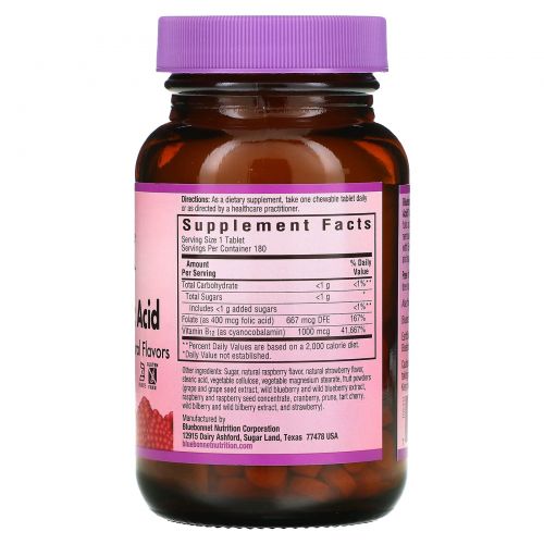 Bluebonnet Nutrition, EarthSweet, витамин B-12 и фолиевая кислота, натуральный малиновый ароматизатор, 180 жевательных таблеток