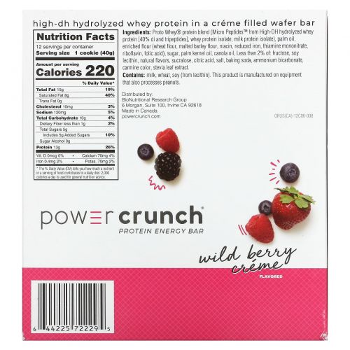 Описание товара BNRG, Power Crunch, протеиновый энергетический батончик с сливочной начинкой и вкусом диких ягод, 12 шт. по 40 г