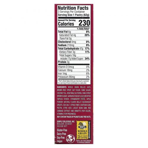 Цельнозерновой плющенный овес, сироп из бурого риса, овсяная мука, тростниковый сахар и кокосовое масло, растительный глицерин, тростниковый сироп, коричневый сахар, бобовая мука, модифицированный тапиоковый крахмал, клубничное пюре, порошок из яблока, натуральный ароматизатор, просо, гречневая крупа, морская соль, клетчатка из цитрусовых, ксантановая камедь, пектин, лимонная кислота, камедь бобов рожкового дерева, экстракт краснокочанной капусты и аннато (для цвета), витамин E (для сохранения свежести).