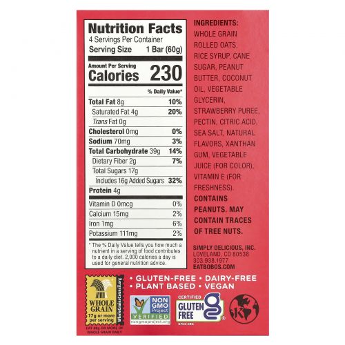 Описание товара Bobo's Oat Bars, PB & Js, клубника, 4 упаковки по 60 г (2,1 унции)