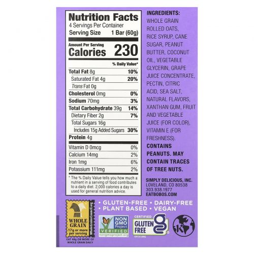 Описание товара Bobo's Oat Bars, PB & Js, виноград, 4 батончика по 60 г (2,1 унции)