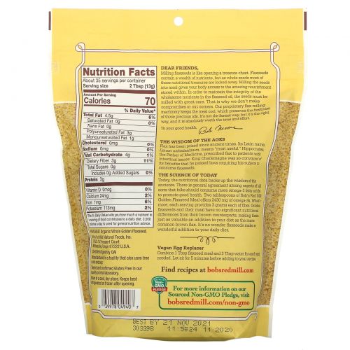 Сегодня данные о питании подтверждают мудрость древних. Среди специалистов различного профиля бытует общее мнение, что люди должны употреблять больше жирных кислот омега-3, чтобы укрепить здоровье. Две чайные ложки Bob's Red Mill Golden Flaxseed Meal содержат 2430 мг жирных кислот Омега-3. Более того, каждая порция содержит по 3 грамма клетчатки и протеина. Золотистые семена льна и мука из них по своим питательным свойствам существенно не отличаются от своих коричневых аналогов, делая их таким же ценным дополнением к вашему питанию, как и более известные коричневые семена. Неудивительно, что льняное семя является отличным дополнением вашего ежедневного рациона питания.