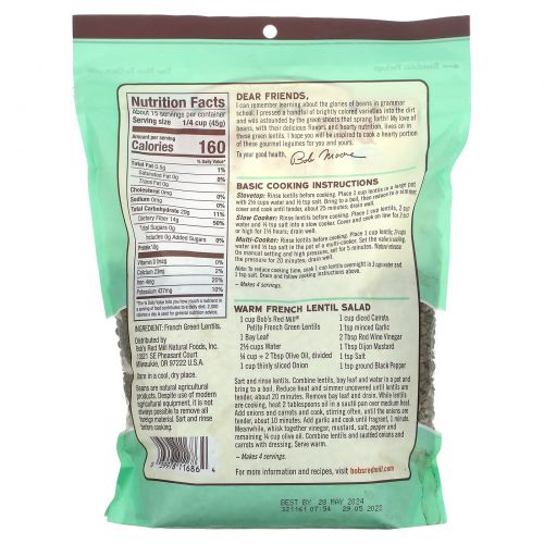 Описание товара Bob's Red Mill, Зеленая чечевица, по-французски, 680 г (1 фунт 8 унций)