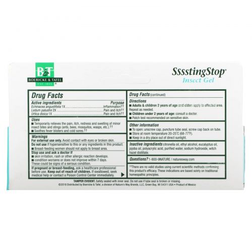 Описание товара Boericke & Tafel, SssstingStop, натуральный гель с цитронеллой, гель для наружного применения, 2,75 унции