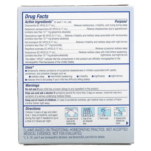 Warnings: Do not use if your child has a known allergy to any ingredients in this product. Stop use and ask a doctor if symptoms persist for more than 3 days or worsen. Insomnia may be a symptom of a serious underlying medical illness. Keep out of reach of children. In case of accidental overdose, get medical help or contact a Poison Control Center right away. � Do not use if glued carton end flaps are open or if inner foil pouch and vials are not intact. � Do not refrigerate or freeze. � After opening foil pouch: store unused vials in the foil pouch for no longer than 3 months at a temperature that does not exceed 77�F (25�C). � After opening the vial: the product mustbe used immediately. � After administering: discard vial. � Do not reuse. � Contains 0.0015 % alcohol. Другие Ингредиенты| Сведения о действующих веществах | |