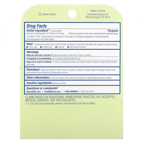 Описание товара Boiron, средство от аллергии на амброзию, гранулы для рассасывания, 3 упаковки по 80 гранул