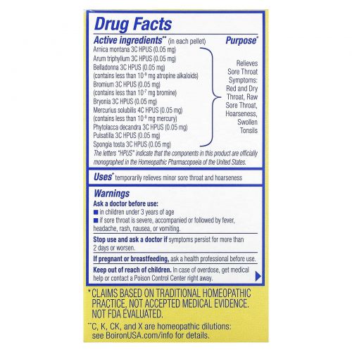 | Арника (Arnica montana) 3C HPUS (0,05 мг) Арум трифиллум 3C HPUS (0,05 мг) Belladonna 3C HPUS (0,05 мг) (содержит менее10-9 мг алкалоидов атропина) Бром 3C HPUS (0,05 мг) (содержит менее10-7 мг брома) Бриония 3C HPUS (0,05 мг) Меркурий солюбилис 4C HPUS (0,05 мг) (содержит менее10–9 мг ртути) Phytolacca decandra 3C HPUS (0,05 мг) Пульсатилла 3C HPUS (0,05 мг) Spongia tosta 3C HPUS (0,05 мг) | Снимает симптомы боли в горле: Красное и сухое горло, саднение в горле, охриплость, отек миндалин |