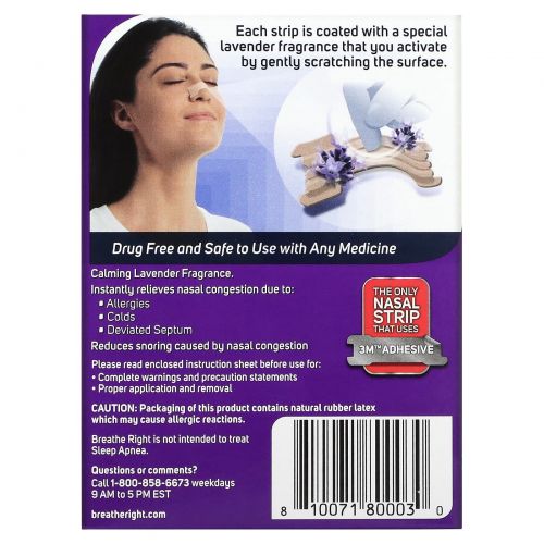 Описание товара Breathe Right, Полоски для носа, успокаивающая лаванда, 26 ароматических полосок