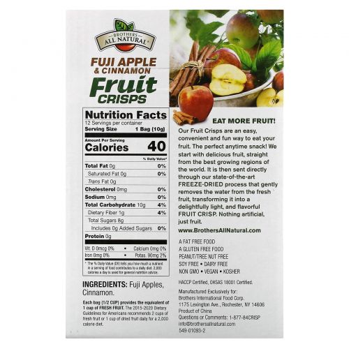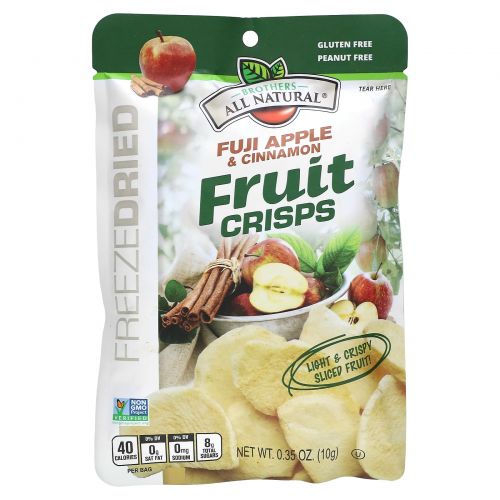 Описание товара Brothers-All-Natural, фруктовые чипсы, яблоко и корица, 12 отдельных порционных пакетиков по 10 г (0,35 унции)