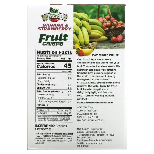 Описание товара Brothers-All-Natural, Набор фруктовых чипсов, замороженные и высушенные клубника и бананы, 12 порционных пакетиков, 0.42 унций (12 г) каждый