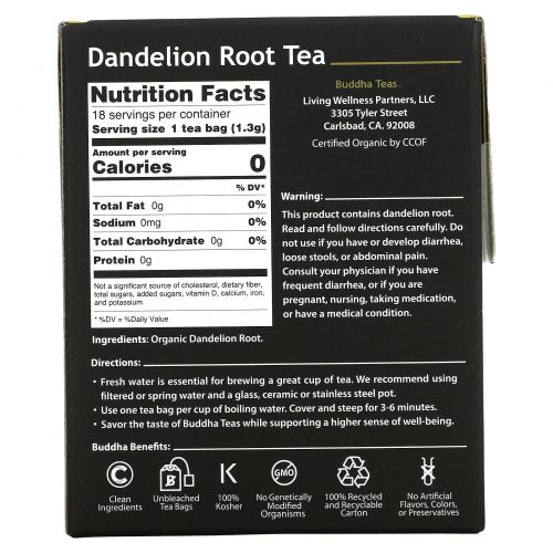 Описание товара Buddha Teas, Organic Herbal Tea, Dandelion Root, 18 Tea Bags, 0.83 oz (24 g)