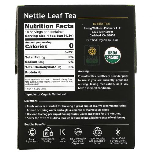 Описание товара Buddha Teas, Organic Herbal Tea, Nettle Leaf, 18 Tea Bags, 0.83 oz (24 g)