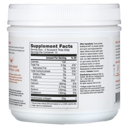 Описание товара BulletProof, пептиды коллагена, с шоколадным вкусом, 405 г (14,3 унции)