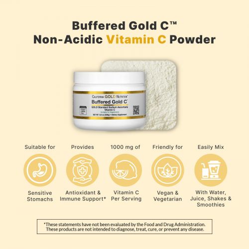 Buffered Gold C™ от California Gold Nutrition представляет собой некислую форму витамина С в форме аскорбата натрия. Буферизованный витамин С в форме порошка — это простой и экономичный способ получить индивидуальную дозу витамина С для людей с чувствительной пищеварительной системой. Buffered Gold C™ можно смешивать с водой, соком или другими напитками.