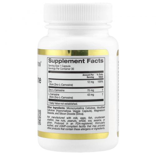Комплекс с цинком и L-карнозином от California Gold Nutrition содержит цинк-L-карнозин в растительных капсулах. Он подходит для вегетарианцев и веганов и не содержит глютена, ГМО и сои.